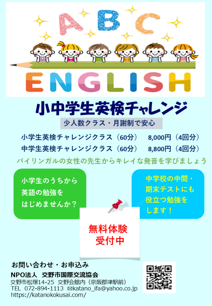 バイリンガル講師による各小・中学生向けの英検クラスの受講生を募集しています。
