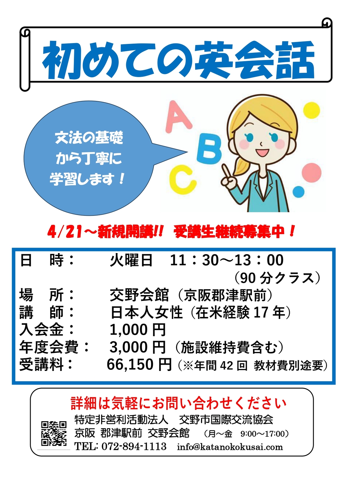 「今から英語を始めたい!」「ブランクがあってまた基礎から復習したい!」という人にピッタリのクラスが開講します!
